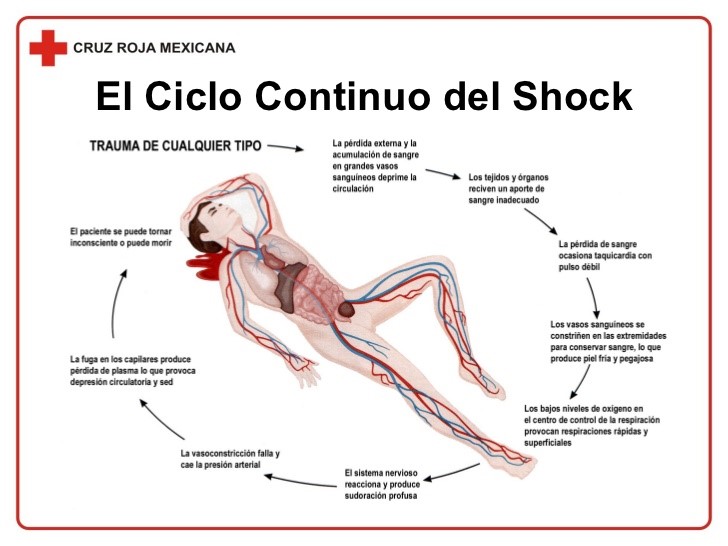 En la etapa de irreversibilidad el pulso se vuelve indetectable, bradicardico y con arritmias cardiacas, respiración agonica, sin tensión arterial, cesa la producción de sudor, extremidades cianóticas y cereas, piel pegajosa, hipoxia cerebral e insuficiencia cardiaca o renal.